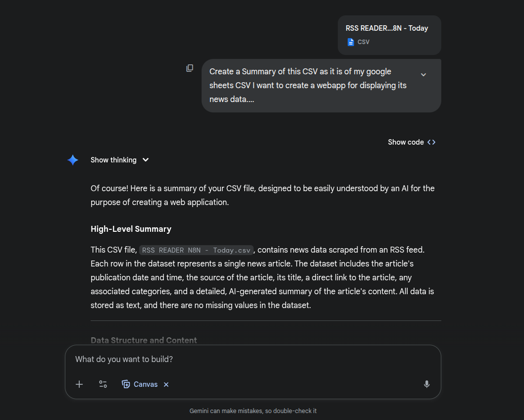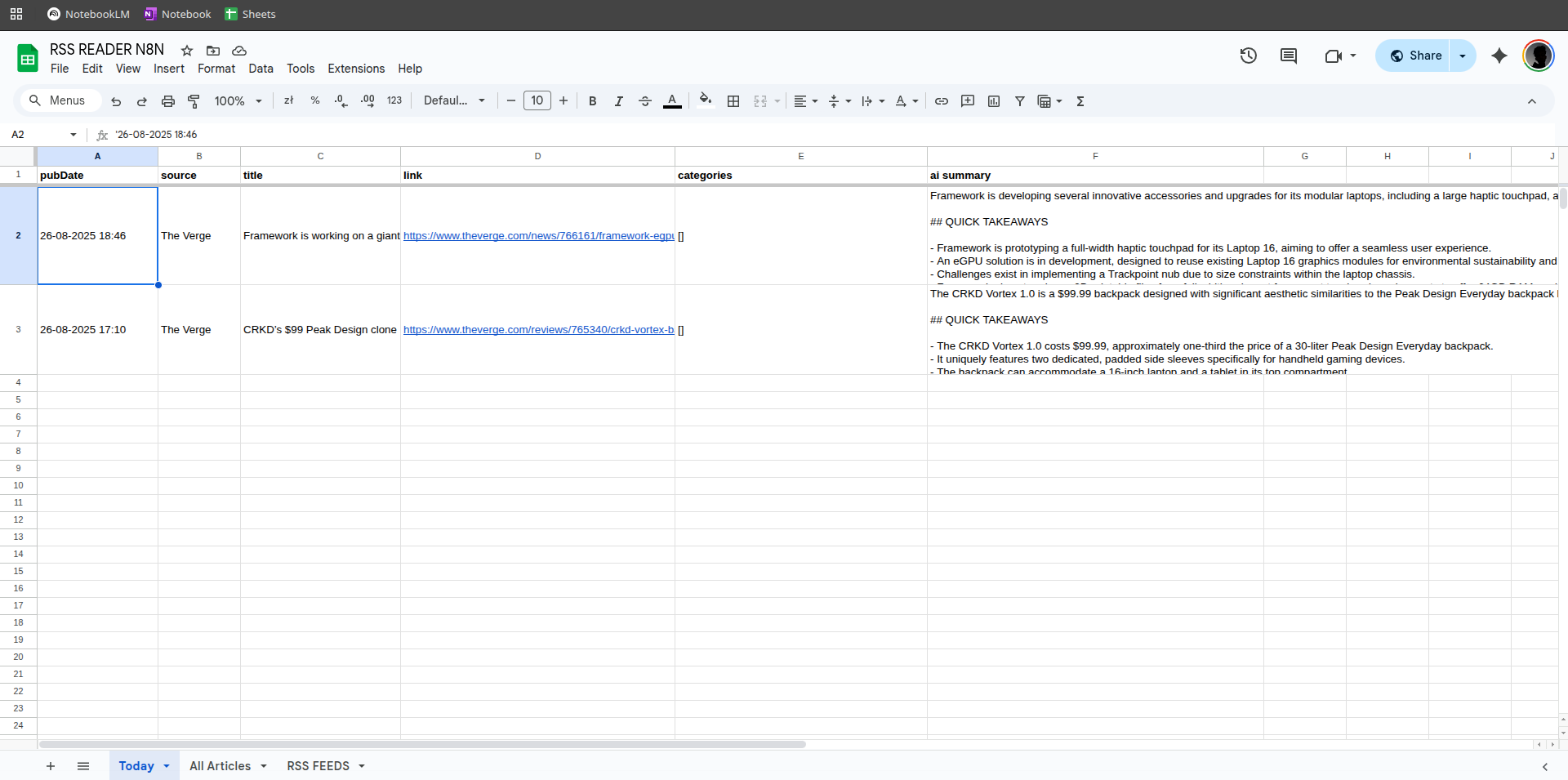 - Google Sheets as a Database: Why spin up a complex database for a prototype? My n8n workflow pipes all the processed articles title, source, link, and the new AI summary directly into a simple Google Sheet. It’s simple, visual, and works perfectly.