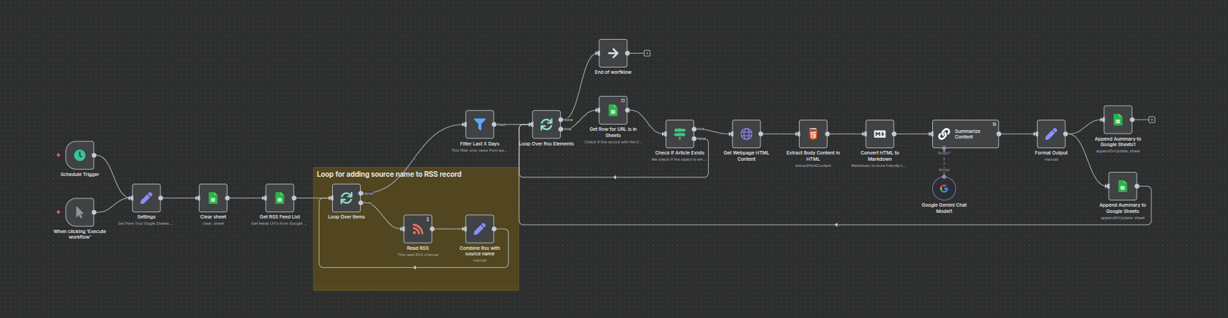 - n8n for Workflow Automation: I created a visual workflow in n8n that acts as an intelligent agent. It automatically scans my favorite RSS feeds, fetches new articles, and this is the crucial part. Sends the content to the Google Gemini AI for a detailed summary.