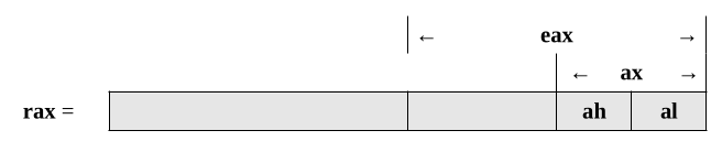 As shown in the diagram, the first four registers, rax, rbx, rcx, and rdx also allow the bits 8-15 to be accessed with the ah, bh, ch, and dh register names. With the exception of ah, these are provided for legacy support.